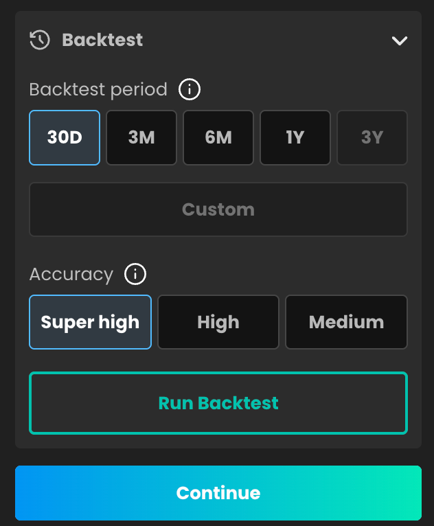 You can select 30D in the Backtest period settings to evaluate your strategy using historical data before deploying it